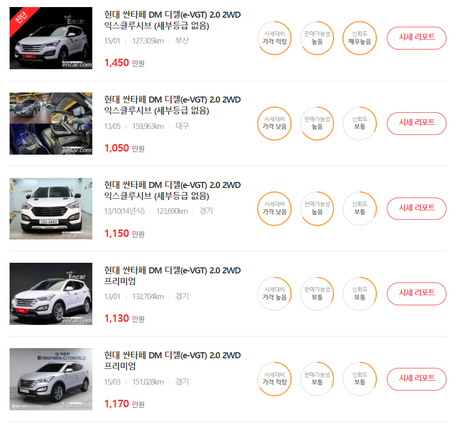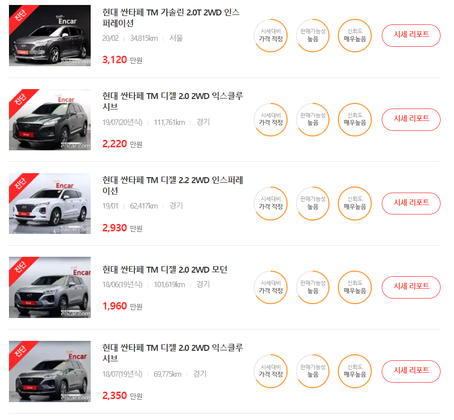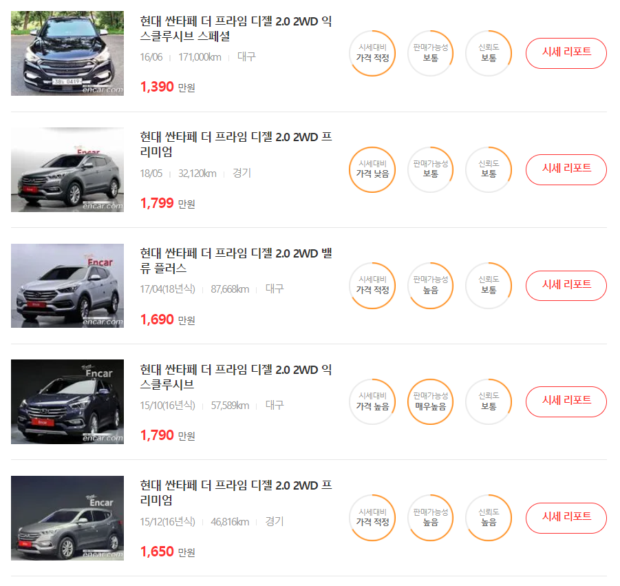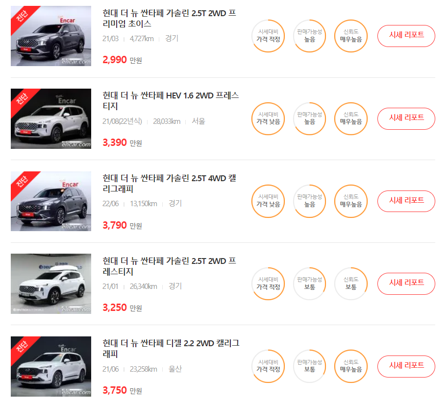 싼타페의 중고차 가격 시세는 매달 달라지고 있기 때문에 차량 구매를 생각하고 계신 분들이라면, 꾸준히 중고차 매매사이트에 방문하셔서 적당한 시세가 어떻게 형성되고 있는지 살펴보는 것이 좋습니다. 중고차 매매사이트는 엔카 이외에도 케이카, KB차차차, 첫차, 헤이딜러 등 다양하니 여러 곳을 방문하셔서 많은 차량을 보시길 바라겠습니다.