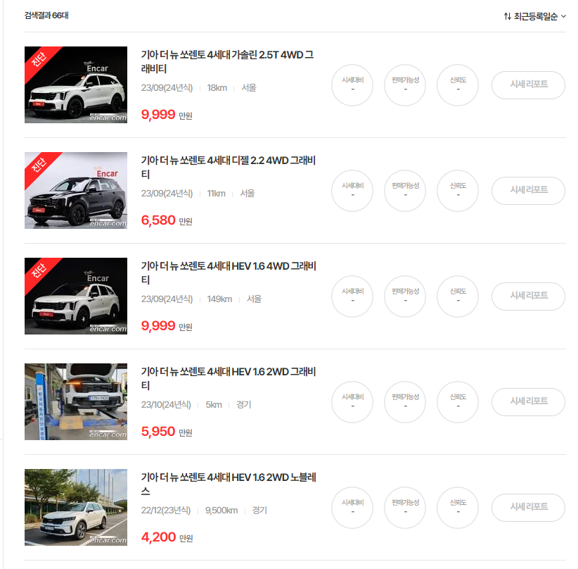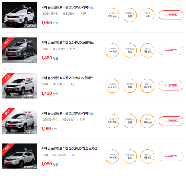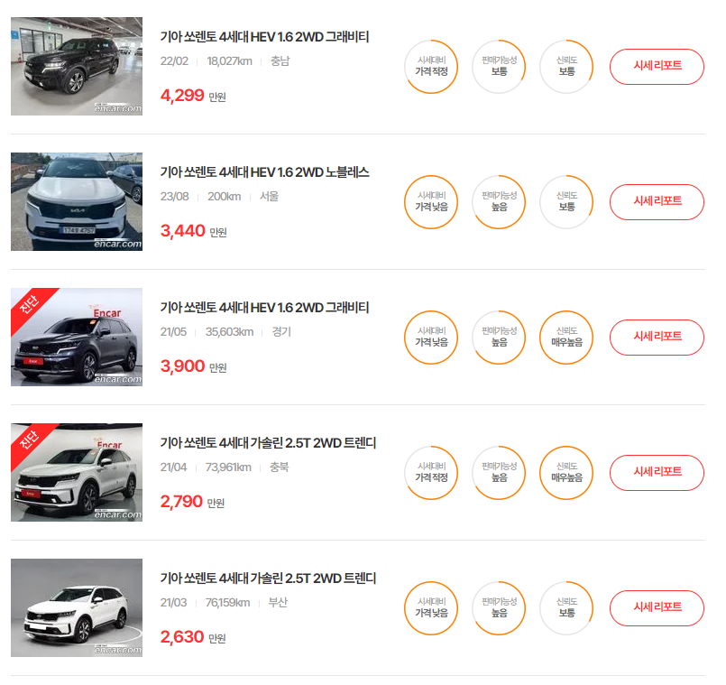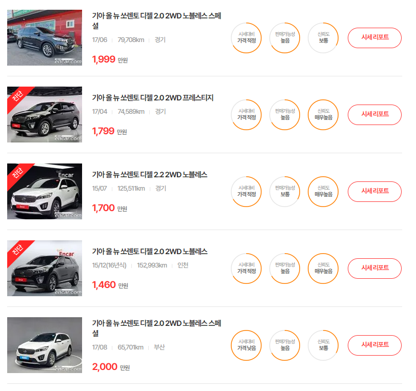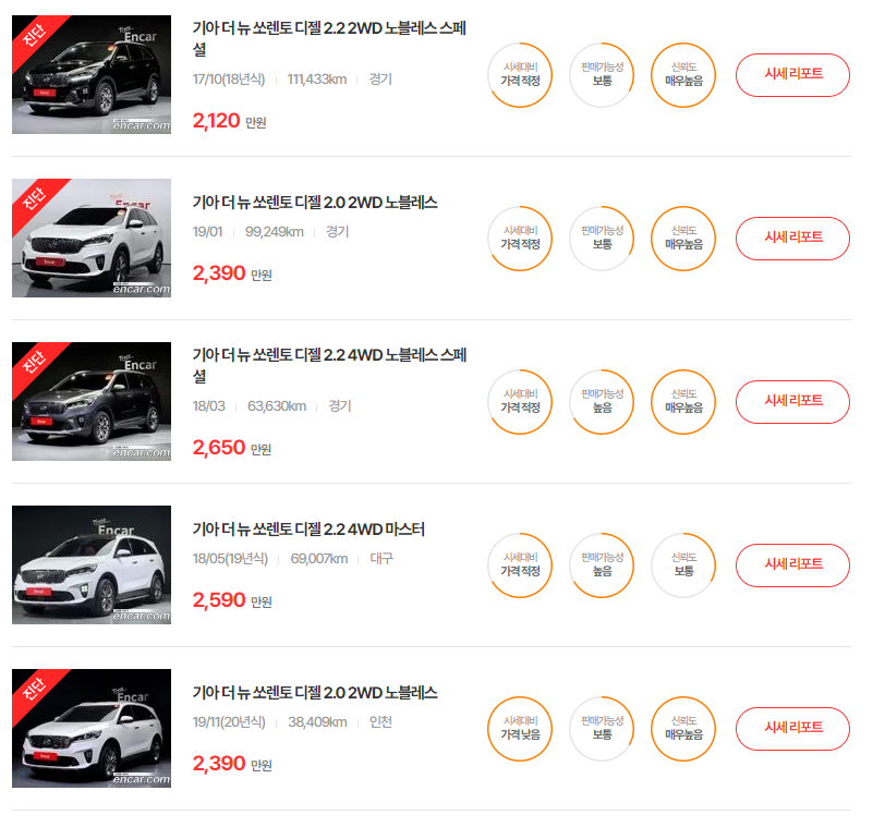 쏘렌토의 중고차 가격은 매주 매달 달라지고 있습니다. 정확한 시세를 알아보시려면, 다양한 중고차 매매사이트에 등록되어 있는 매물들을 직접 확인하시는 것이 가장 좋은 방법입니다. 중고차 매매사이트는 엔카 이외에도 KB차차차, 케이카, 첫차, 헤이딜러, 보배드림 등이 있으니, 꼭 인증된 사이트에서 차량을 알아보시길 권해드립니다.