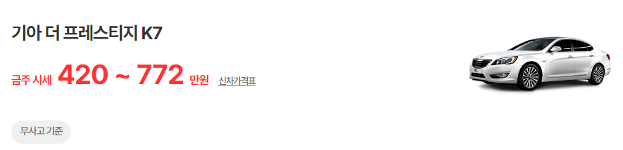 더 프레스티지 K7의 중고차 가격은 420 ~ 772 만원 입니다. 10년이 더 넘은 중고차로 500만원 선에서 구할 수 있는 모델입니다. 1세대 모델에 엔진 라인업을 변경하고 옵션에도 큰 변화를 주어 깡통 모델도 7인치 컬러 LCD 클러스터와 풀 오토 에어컨이 기본으로 장착되어 있습니다.