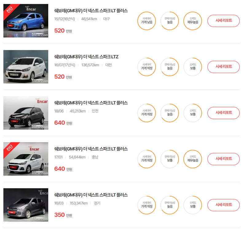 중고차를 구매하실 때는 엔카 이외에도 다양한 중고차 매매사이트를 들어가셔서 실매물의 현황을 보시는 것이 가장 좋습니다. 스파크의 경우 엔카에는 총 2,749대, KB차차차에는 3,964대, K카에는 61대의 매물이 등록되어 있습니다. 중고차의 매물 대수와 시세는 수시로 달라질 수 있으니 참고하시길 바라겠습니다.
