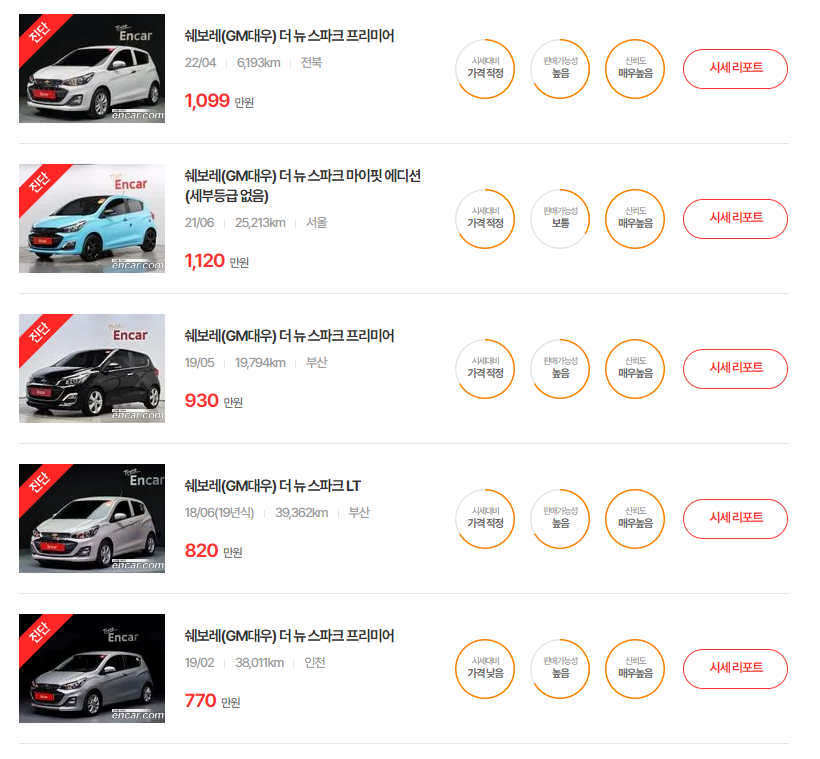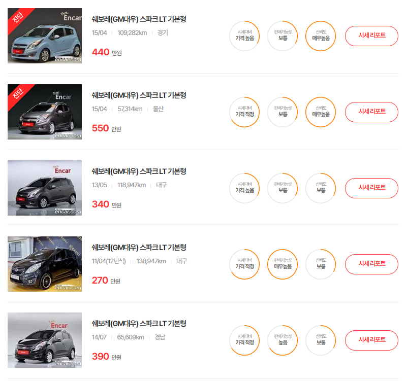 이상으로 오늘은 쉐보레 스파크의 중고차 가격 시세에 대해 연식별로 알아보았습니다. 감사합니다.