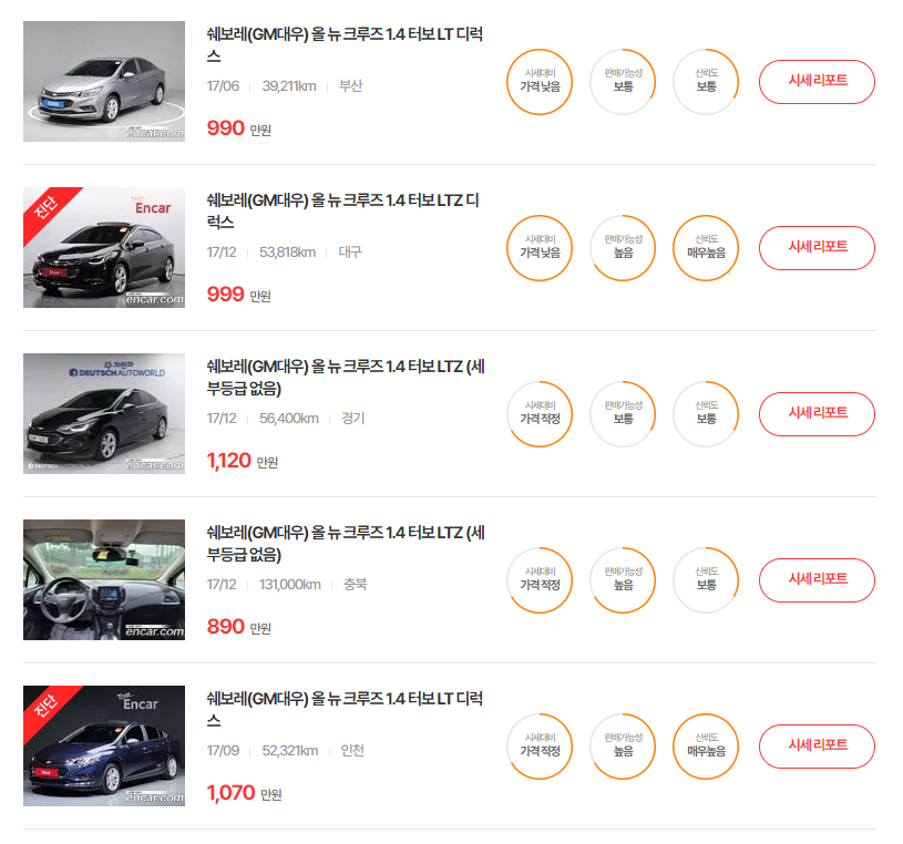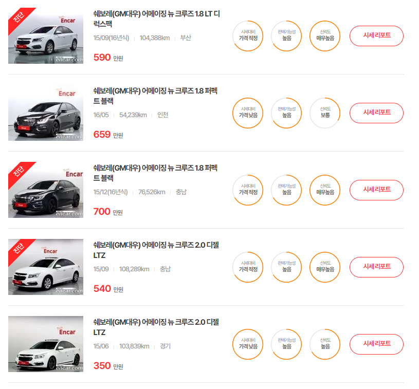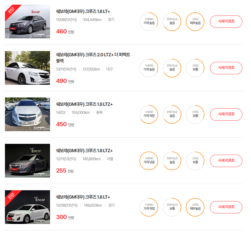 이상으로 오늘은 쉐보레 크루즈의 중고차 가격 시세를 연식별로 자세히 알아보았습니다. 감사합니다.