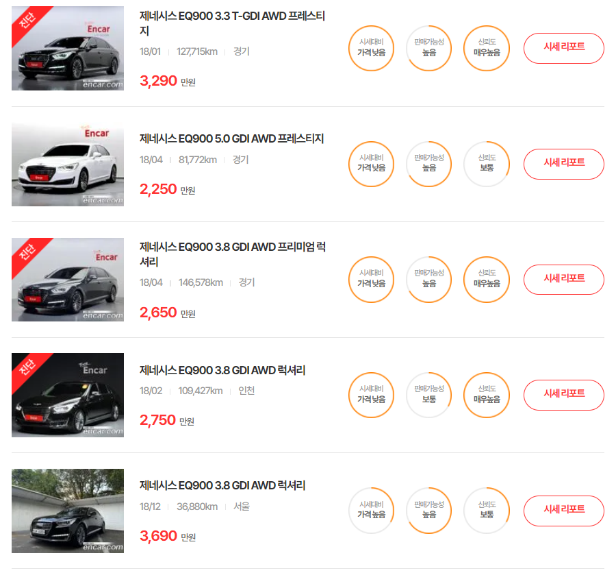 제네시스 EQ900의 중고차 매물 현황은 엔카 601대, KB차차차 669대, K카 34대로 KB차차차에 매물이 가장 많습니다. KB차차도 엔카와 비슷하게 딜러들이 매물을 등록하는 방식이며, 중고차를 알아보실 때 엔카는 엔카인증, KB차차차는 KB보증을 받은 매물인지 꼭 확인하시길 바랍니다. 각 회사의 인증을 받은 차들은 허위매물이 아니며, 성능 증빙 등 대부분 자료들을 믿을 수 있기 때문입니다.