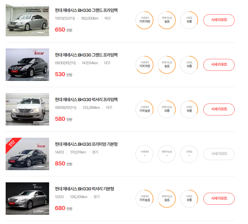 제네시스 BH(08 ~ 13년) 중고차 시세