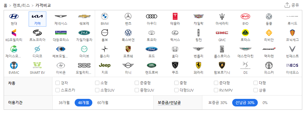 1.사이트 접속 후 원하는 차량의 제조사, 차종 선택