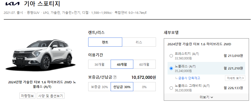 24년형 스포티지 가솔린 터보 1.6: 월 221,210원