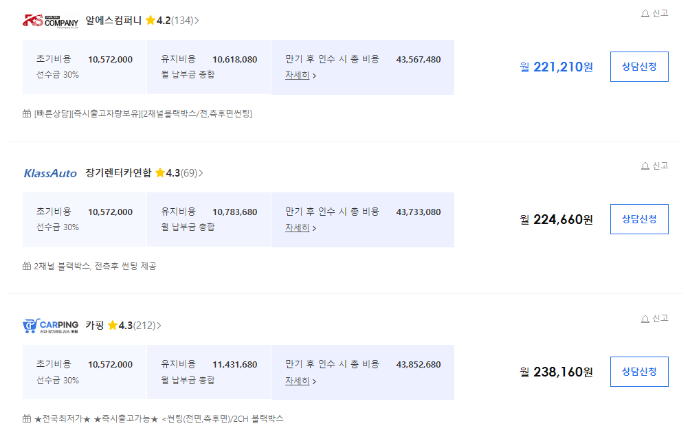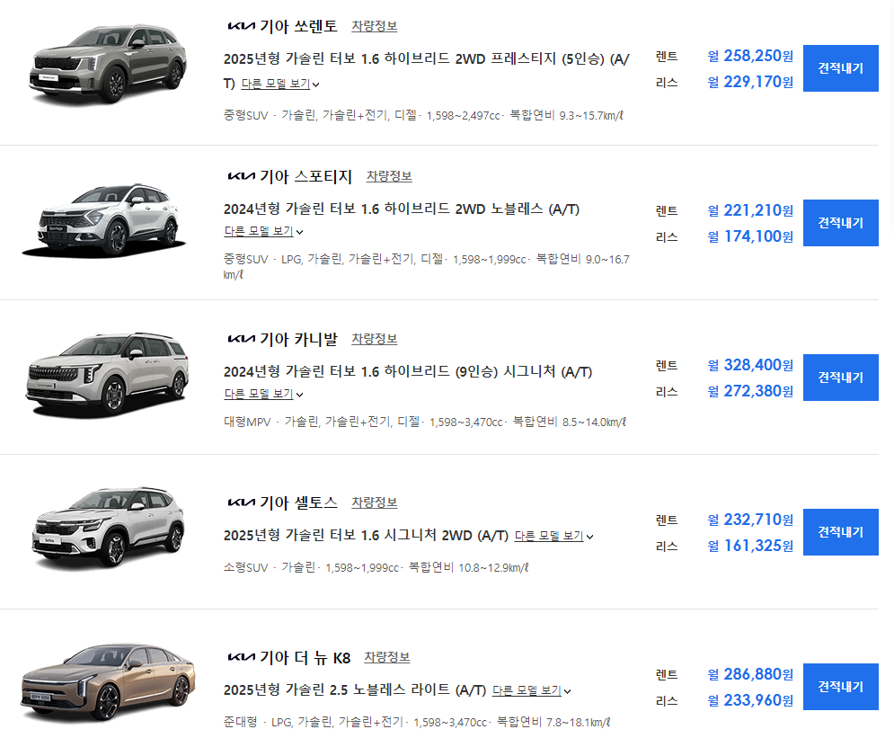 기아자동차 역시 대부분의 모델들을 20만원 후반대로 이용할 수 있으며, 특히 SUV 모델들의 인기로 쏘렌토 및 카니발등의 매물이 많다고 합니다.