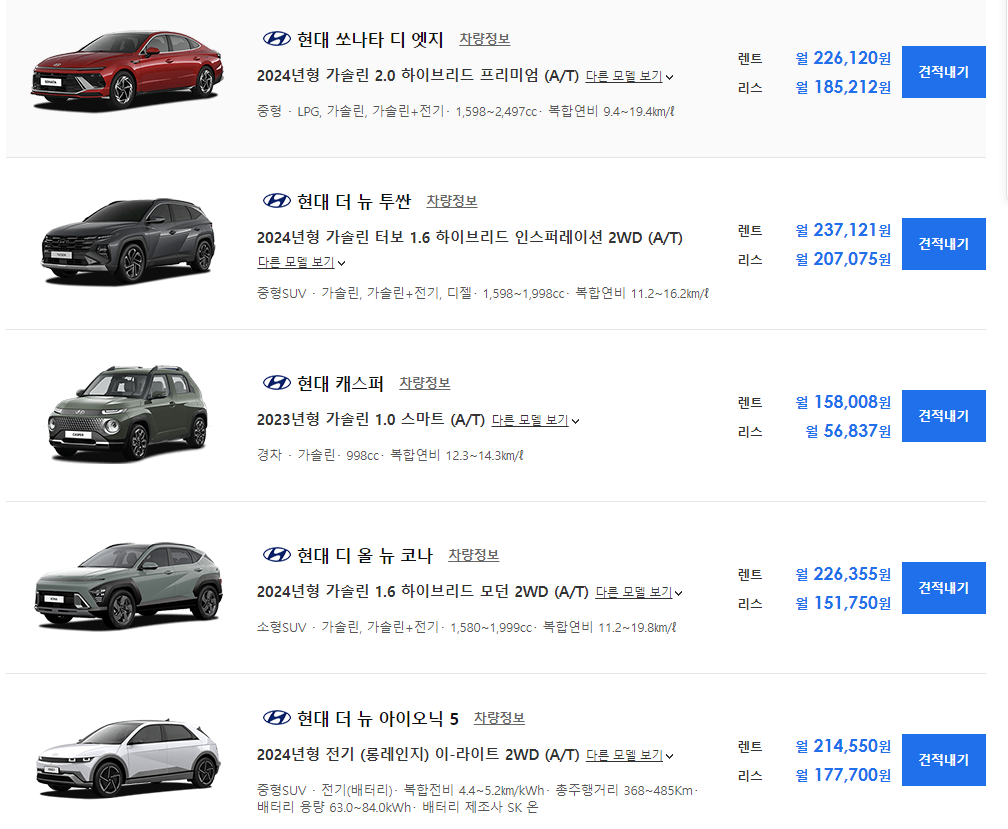 최신 현대차의 대부분 모델들을 20만원 후반대에서 30만원 초반대에 이용할 수 있습니다. 현대차 중에서는 중형SUV 디 올 뉴 싼타페가 인기가 가장 많으며, 더 뉴 아반떼, 디 올 뉴 그랜저 순으로 이용하는 분들이 많습니다.