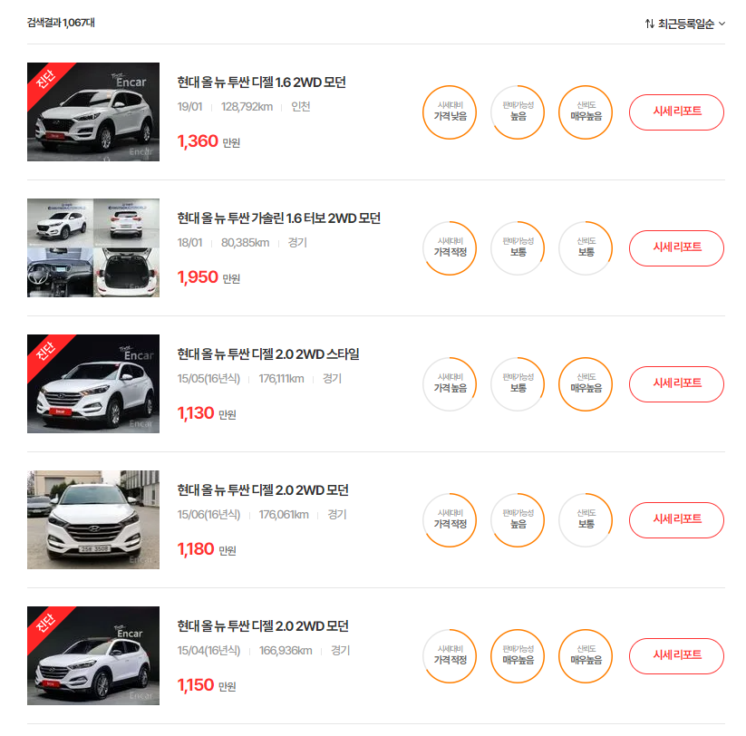 올 뉴 투싼(15 ~ 20년) 중고차 시세