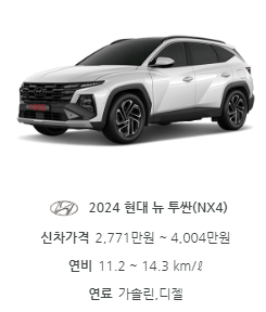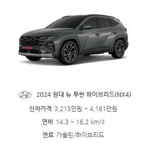 24년식 더 뉴 투싼의 신차 가격은 2,771 만원 ~ 4,161 만원 입니다. 가솔린 하이브리드의 경우 가장 낮은 트림으 3,213 만원 부터 시작하니 이점 참고하시면 좋겠습니다.
