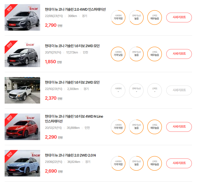 현대 코나의 중고차 매물은 엔카 1,449대, KB차차차 1,112대, K카 206대로 엔카에 가장 많은 매물이 등록되어 있습니다.