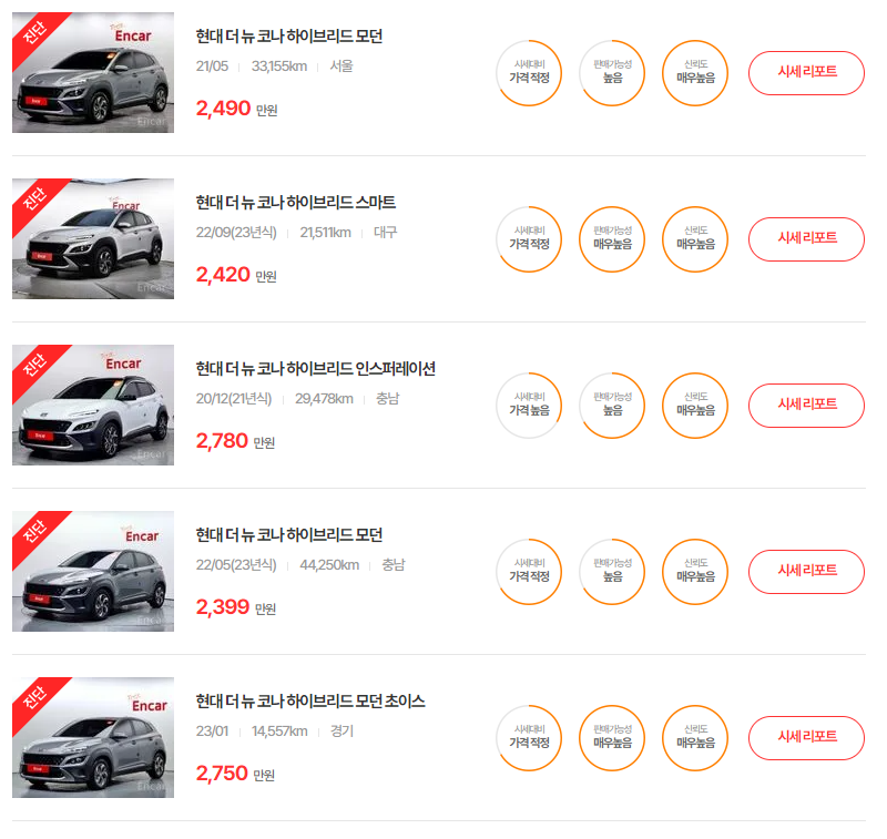 코나 하이브리드(19 ~ 23년) 중고차 시세