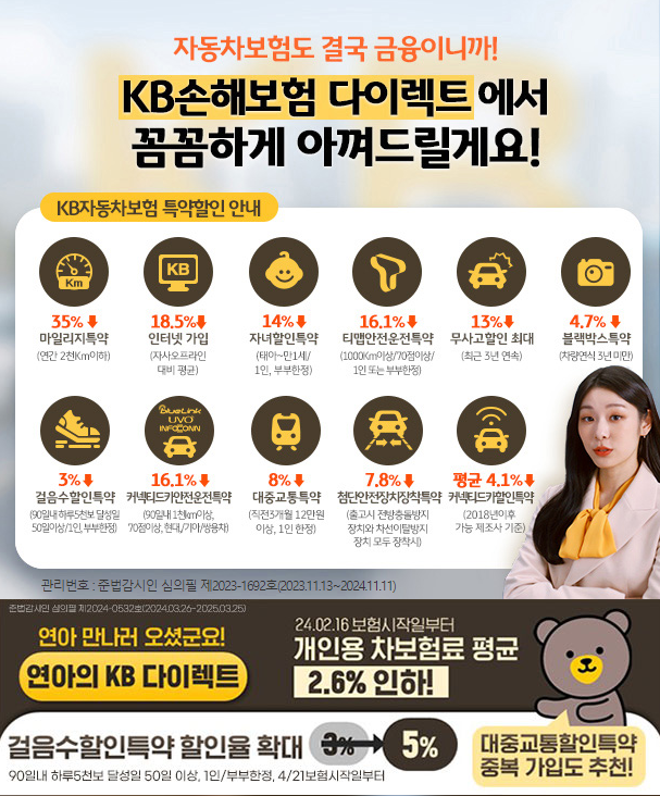 KB손해보험은 자동차보험 업계의 후발주자로 3위까지의 회사들에 비해 점유율이 아직까지는 낮은 편입니다. 따라서 고객들에게 좀 더 다양한 혜택을 주기 위해 노력하는데요, 걸음수할인, 대중교통 할인, 마일리지 할인 등 고객의 특성에 따라 받을 수 있는 할인이 많습니다. 걸음수 할인 특약과 대중교통 할인은 중복 가입도 가능해 출퇴근을 대중교통으로 하시는 분들에게 좋아 보입니다.