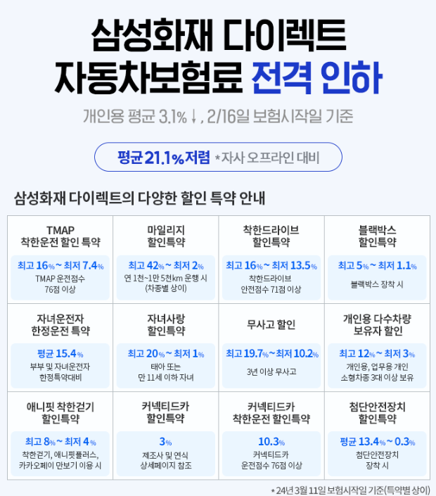 자동차보험 순위 1위에 빛나는 삼성화재는 저렴한 보험료가 가장 큰 장점입니다. 대부분 보장해주는 내용은 비슷하기 때문에 비용적인 측면이 소비자에게 가장 크게 다가오겠죠. 삼성화재는 브랜드 평판 뿐만아니라 실제 가입자수도 국내 보험사 중 가장 많기 때문에 사람들의 다양한 후기를 참고할 수 있어 좋습니다.