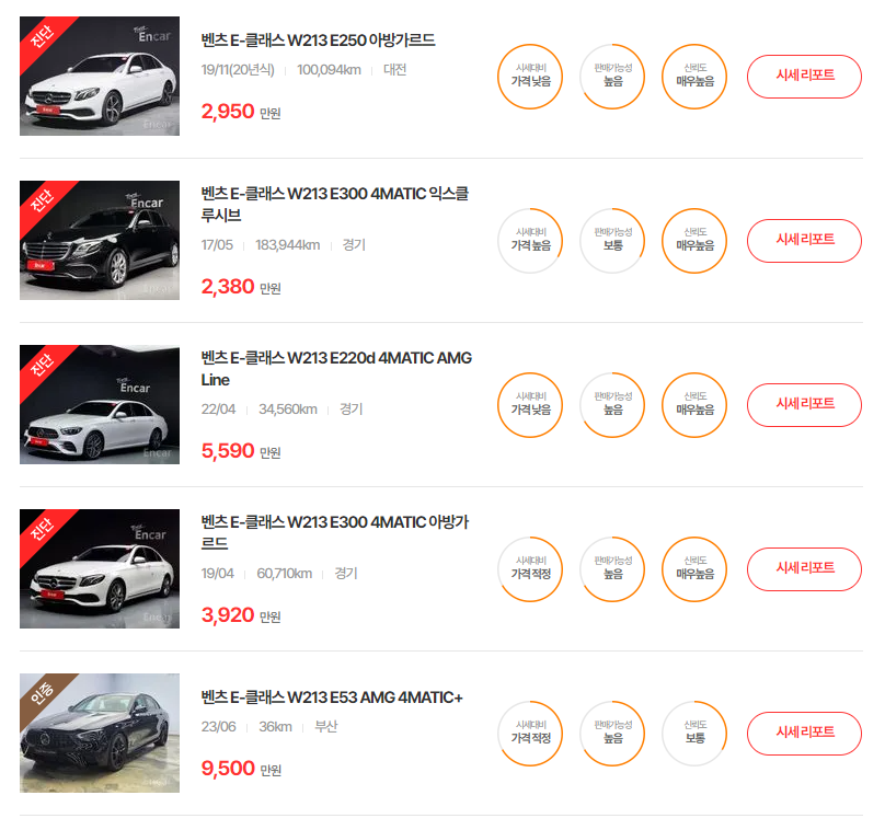 벤츠 E클래스의 중고차 매물 현황은 엔카 3,184대, KB차차차 2,182대, K카 136대로 엔카에 가장 많은 매물이 등록되어 있습니다. 이 중 가장 많은 매물이 10세 E클래스인 w213 모델이며, 매달 수입차 중고 거래량 1위를 차지하고 있습니다.