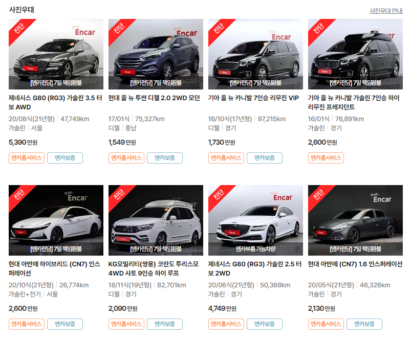 엔카와 같은 플랫폼에서는 서류상 문제가 있는 차량을 1차적으로 걸러주지만, 실제로 차량을 직접 확인하고 운전해보면 전 차주의 관리 상태나 차량의 사용 이력에 따라 차량 상태가 크게 달라집니다.