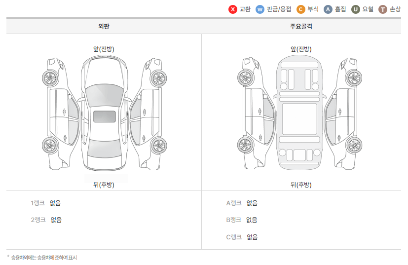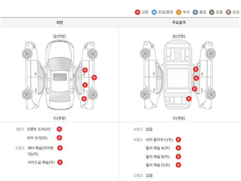 이러한 중고차 상태 정보를 파악하여 사고차량인지, 보험이력은 얼마나 있는지, 주인은 몇 번이나 바뀌었는지 등 쉽게 확인할 수 있습니다. 위 사진은 성능점검표에 있는 부품 교환 이력입니다. 흔히 사고가 나면 수리를 통해 교체하는 것인데요. 외판은 단순 접촉 사고로 차량에 전혀 문제가 없지만, 주요골격 부분을 교환 및 판금한 차량을 절때 구매하시면 안됩니다.