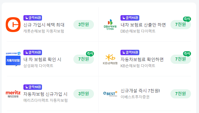 또한, 네이버 페이에서도 자동차보험 가입 혜택을 받을 수 있습니다. 삼성화재 및 KB손해보험 같은 곳에서는 보험료 확인만 해도 즉시 7천원의 네이버 페이를 지급하고 있습니다.