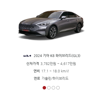 2024년 기아 k8의 신차 가격은 3,299 ~ 4,624만원, 하이브리드 모델은 3,782 ~ 4,617 만원 입니다. 2024년식 K8은 세련된 외관과 고급스러운 인테리어로 주목받고 있습니다. 외관은 날렵하고 세련된 디자인을 갖추고 있으며, 기아의 새로운 패밀리룩을 반영한 대형 그릴과 LED 헤드램프가 특징입니다.