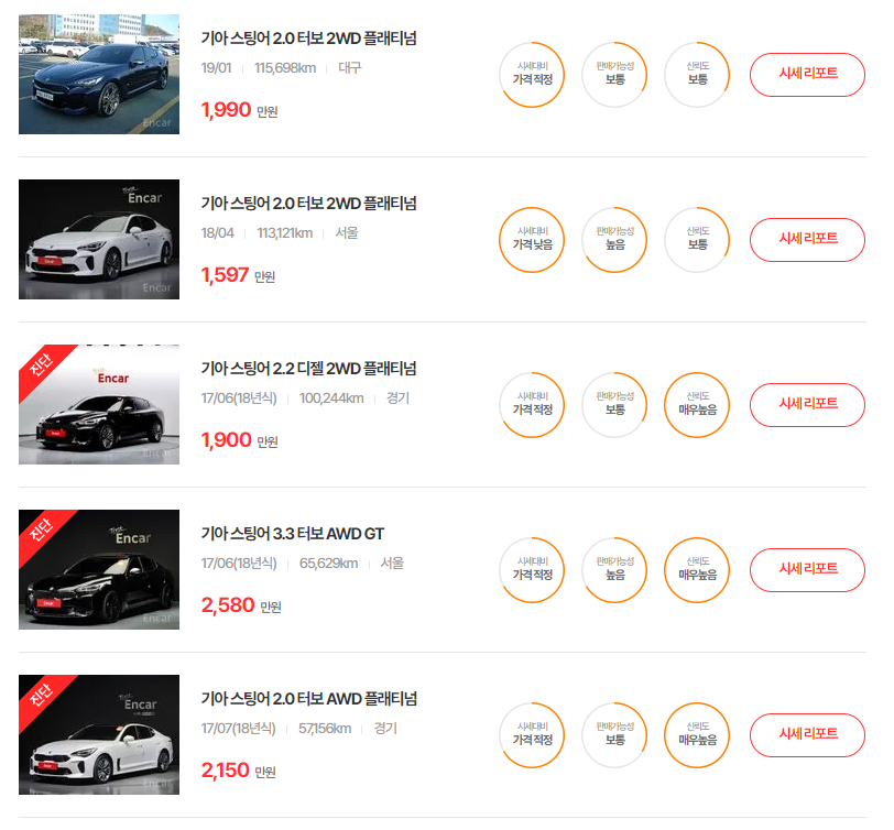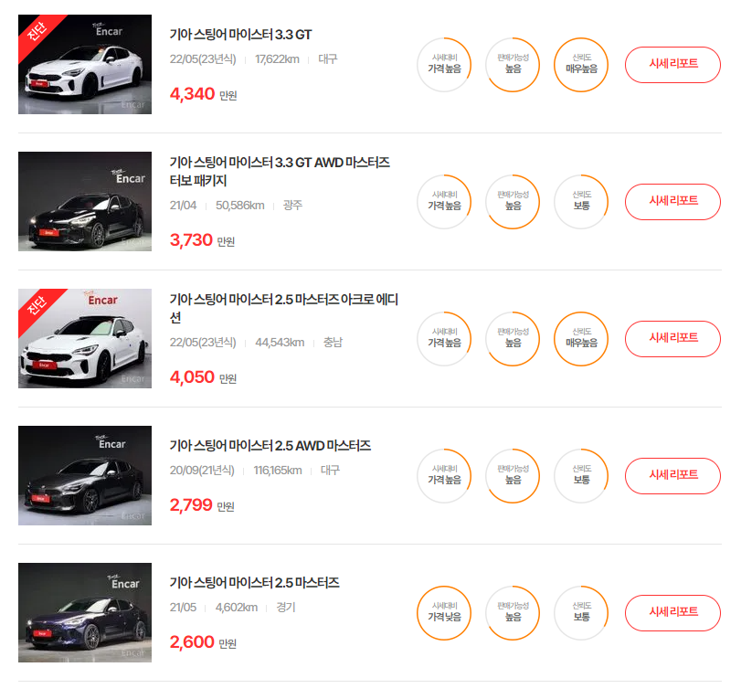 스팅어의 중고차 매물대수를 보면 엔카 596대, KB차차차 396대, K카 27대로 엔카에 가장 많은 매물이 있습니다. 기아 스팅어는 중고차 시장에서 고성능과 디자인, 가성비를 두루 갖춘 모델로서 많은 관심을 받고 있으며, 다양한 모델과 옵션, 안정적인 시세 덕분에 구매자들 사이에서 인기가 높습니다.