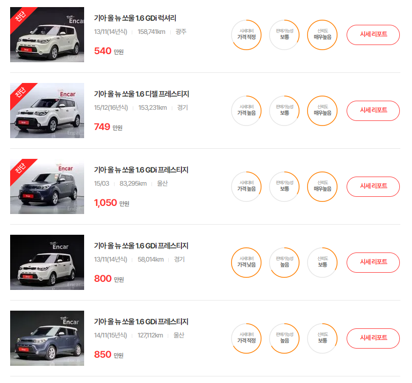 올 뉴 쏘울(13 ~ 16년) 중고차 시세