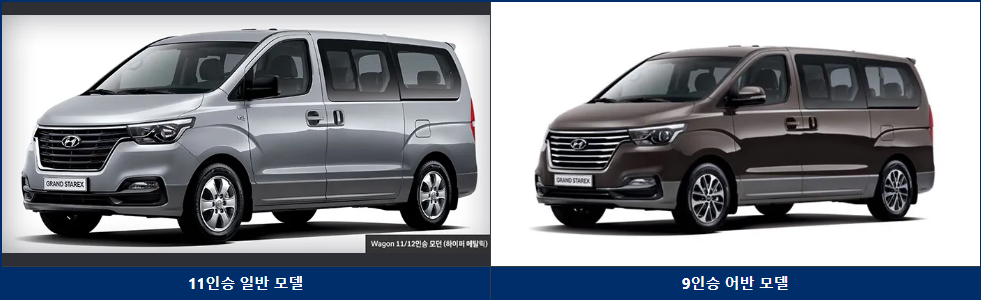 3인승과 5인승은 밴, 11,12인승 웨건 두 등급이 주 차량이며, 리무진 모델과 캠핑카 모델이 따로 분류되어 있습니다. 그랜드 스타렉스는 상업적 용도 이외에도 캠핑 및 레저 활동, 셔틀 버스 등으로 많이 이용되어 왔으며, 사회복지 및 공공 서비스를 제공하는 국가 기관에서도 스타렉스를 유용하게 사용할 수 있습니다.