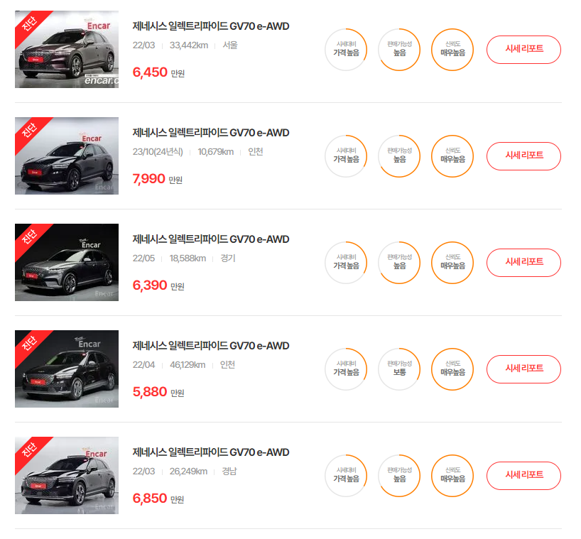GV70 전기차의 중고차 가격은 연식별로 다음과 같습니다.