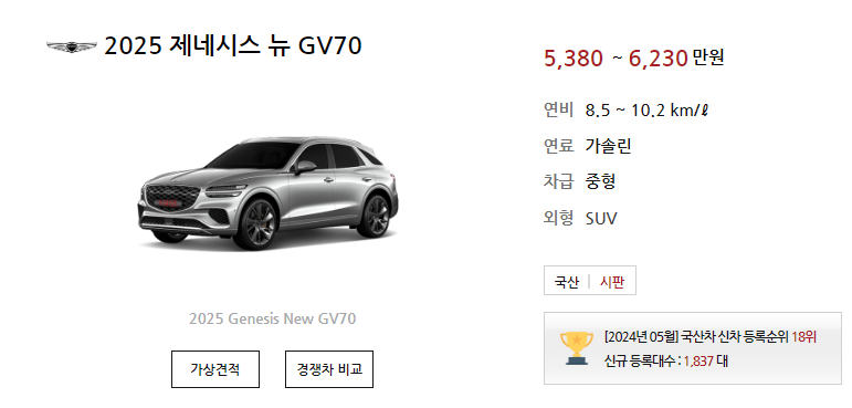 올해 5월 페이스리프트가 되며 더욱 세련되게 돌아온 GV70의 신차 가격과 21년식부터 24년식까지 중고차 가격 시세를 자세하게 알아보겠습니다.
