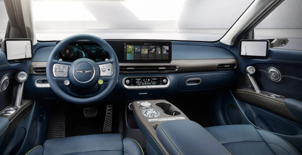 실내 디자인은 12.3인치 디스플레이 두 개가 나란히 배치된 디지털 콕핏과 회전식 크리스털 스피어, 2D 제네시스 로고 등이 적용되었습니다. 디지털 사이드 미러는 옵션으로 제공되며, 투톤 배색 조합이 가능합니다. 터치식 공조기와 뱅 앤 올룹슨 스피커도 탑재되었습니다.