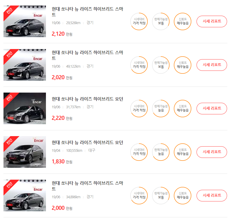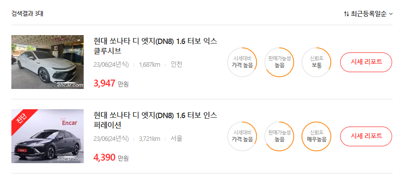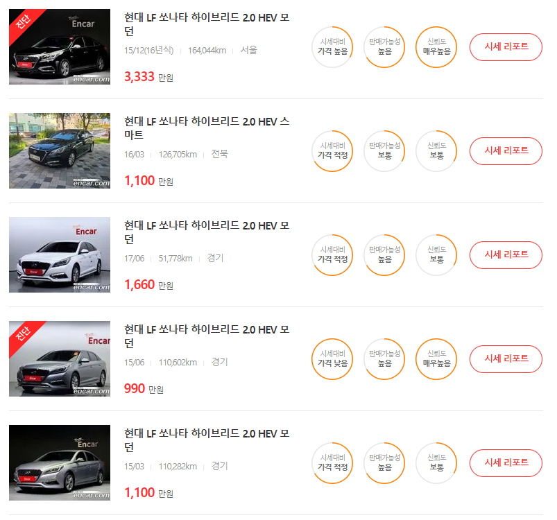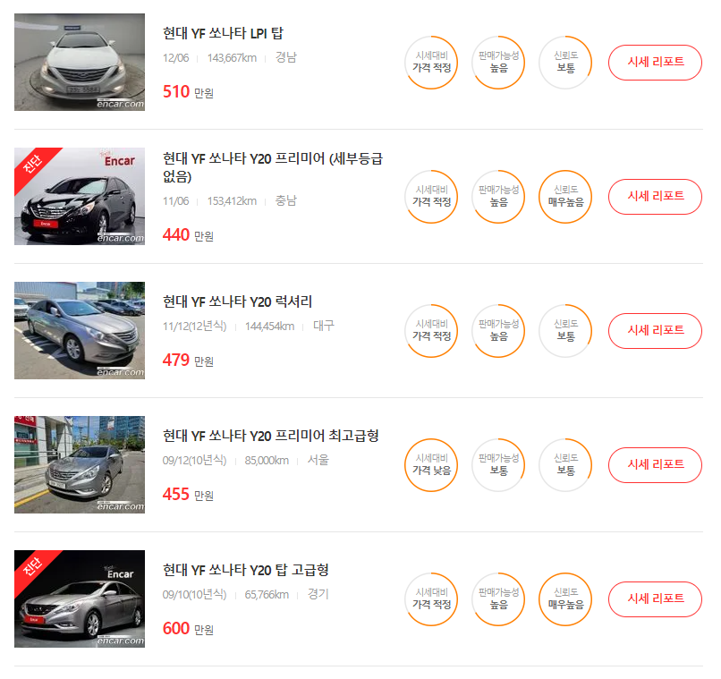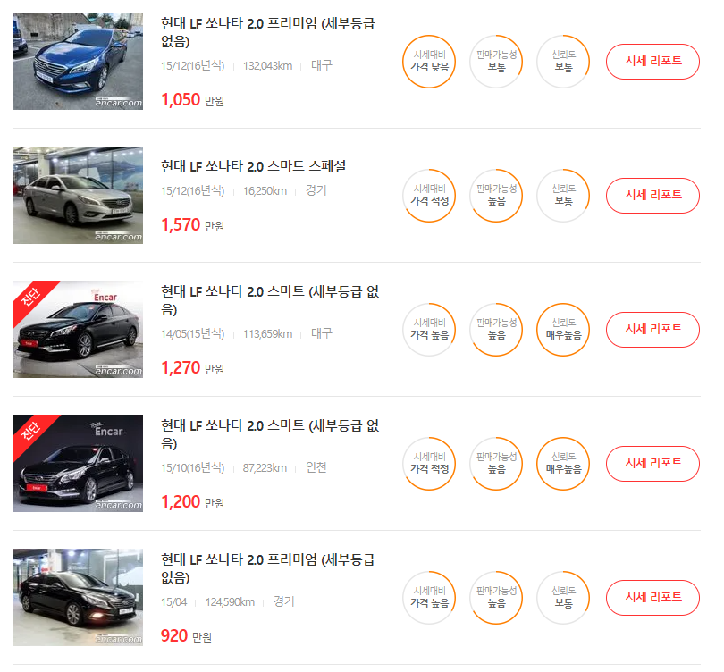 쏘나타의 중고차 시세는 매달 또는 매주 달라지기 때문에 직접 중고차 매매사이트에 방문하셔서 시세를 확인하시는 것이 좋습니다. YF쏘나타와 LF쏘나타는 지금 타도 꿀리지 않을 괜찮은 성능을 가진 차들이기 때문에 엔카 이외에도 매물들이 굉장히 많이 있습니다. 아래 사이트에서 바로 확인해보시길 바라겠습니다.