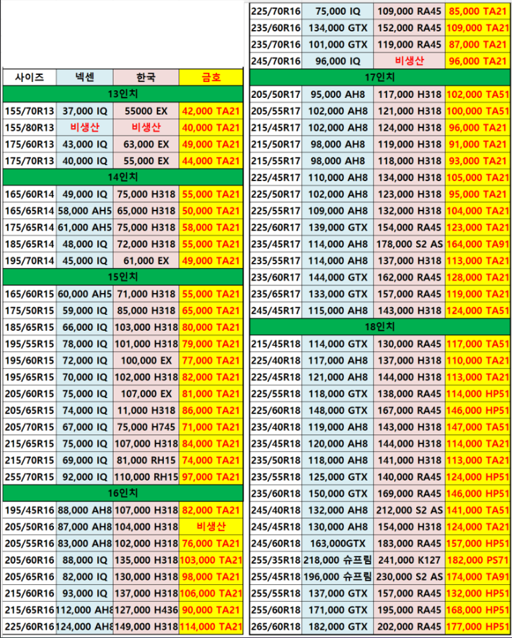 타이어 크기별 각겨표 입니다. 금호 타이어의 가격이 대체로 저렴한 편인 것을 확인할 수 있습니다. 위 표시된 가격은 교체 비용까지 포함된 가격이니, 타이어만 따로 구매하시면 더욱 저렴한 가격에 교체할 수 있습니다.