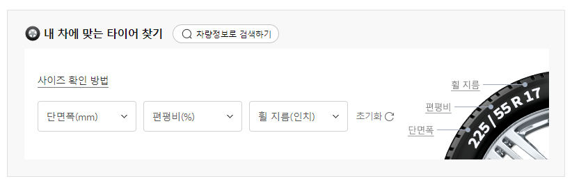 들어가시면 바로 보이는 것이 사이즈 확인 방법 입니다. 위에서 우리가 알아본 205/55R 16을 입력해 보겠습니다.