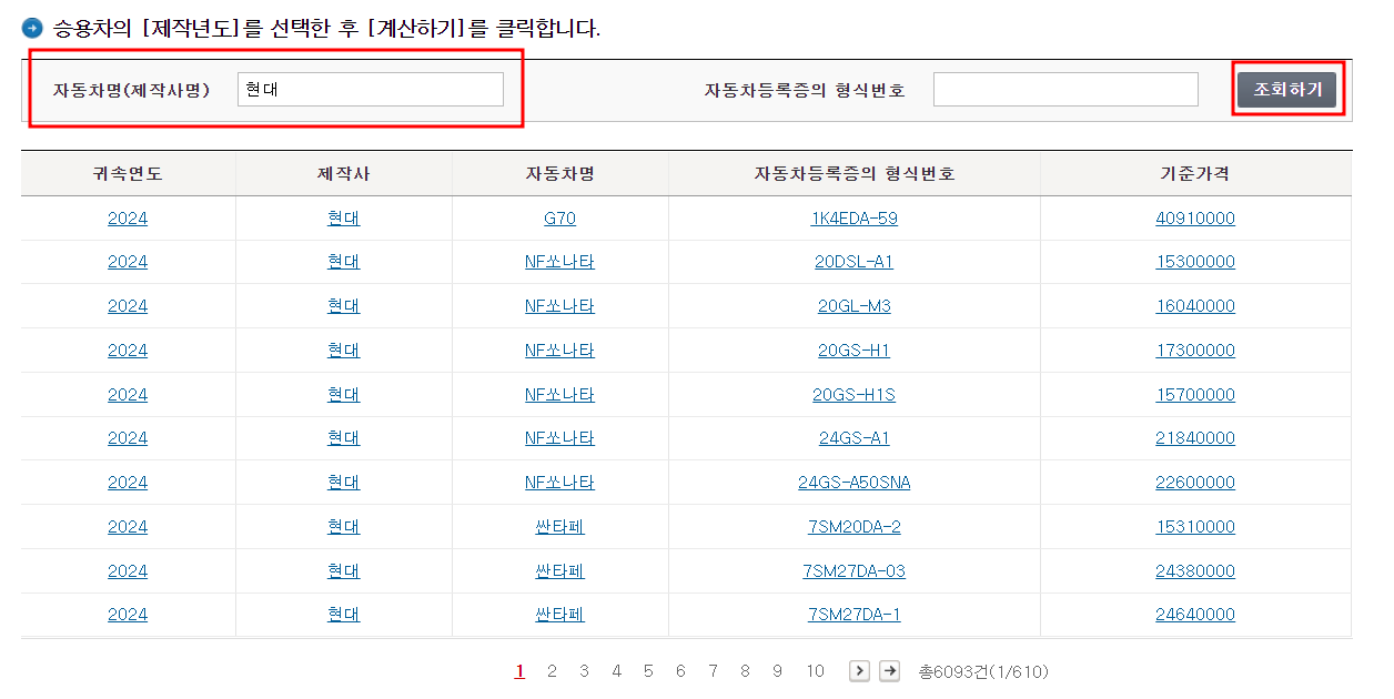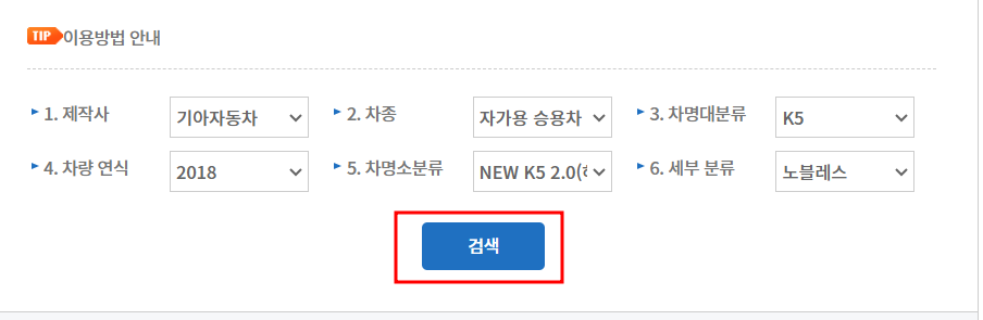 자동차의 제작명(현대, 기아 등)을 입력하고 조회하기를 클릭하시면, 각 제조사의 차량들이 나옵니다.