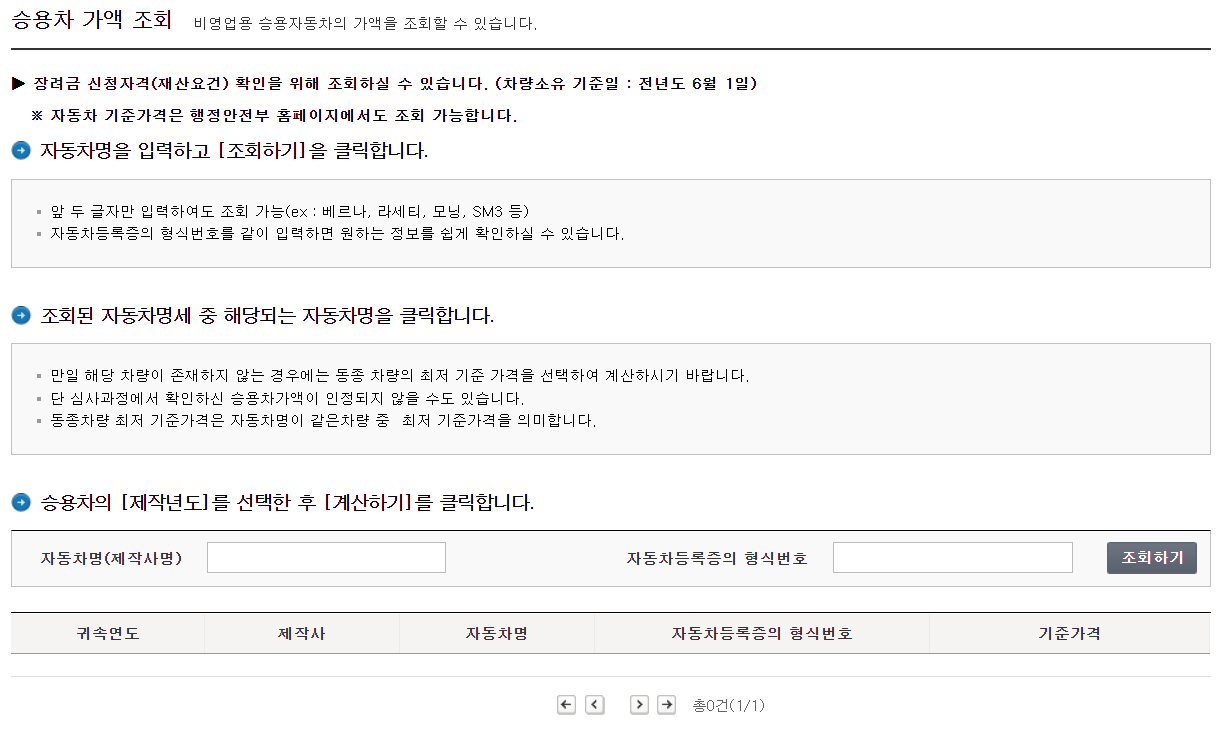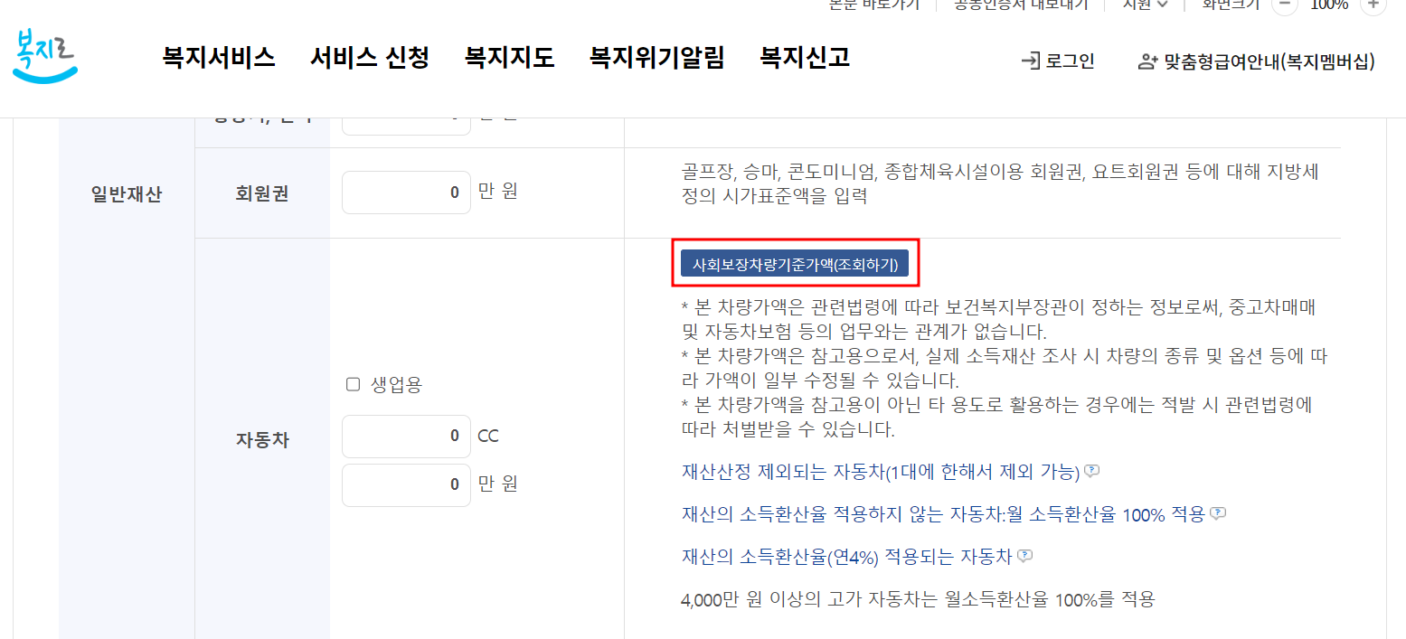 복지로 차량가액 조회