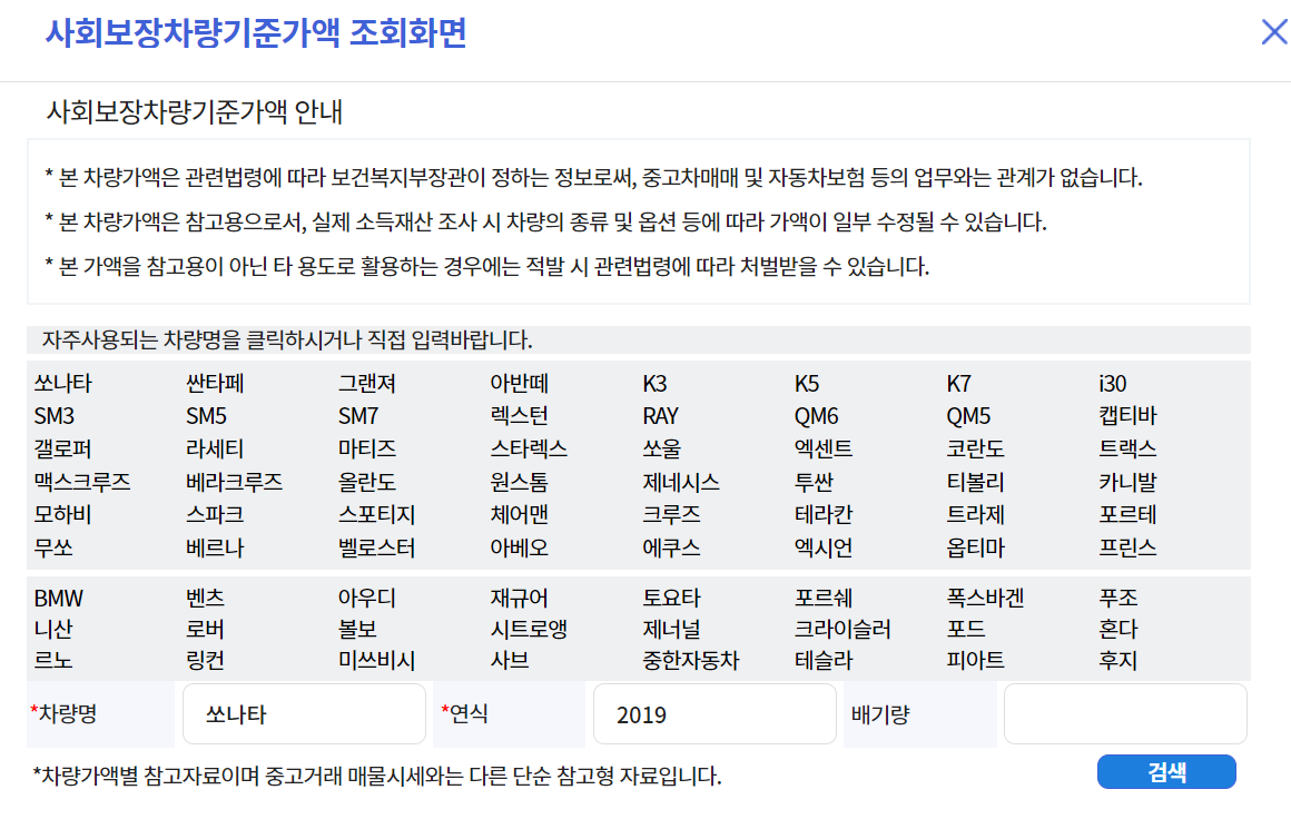 입력한 정보를 바탕으로 차량가액이 조회됩니다. 이 가액은 복지서비스 신청 시 재산 산정에 활용됩니다.