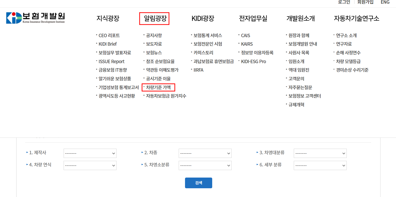 홈페이지에서 "알림광장" , "차량기준 가액" 메뉴를 클릭하여 해당 페이지로 이동합니다.