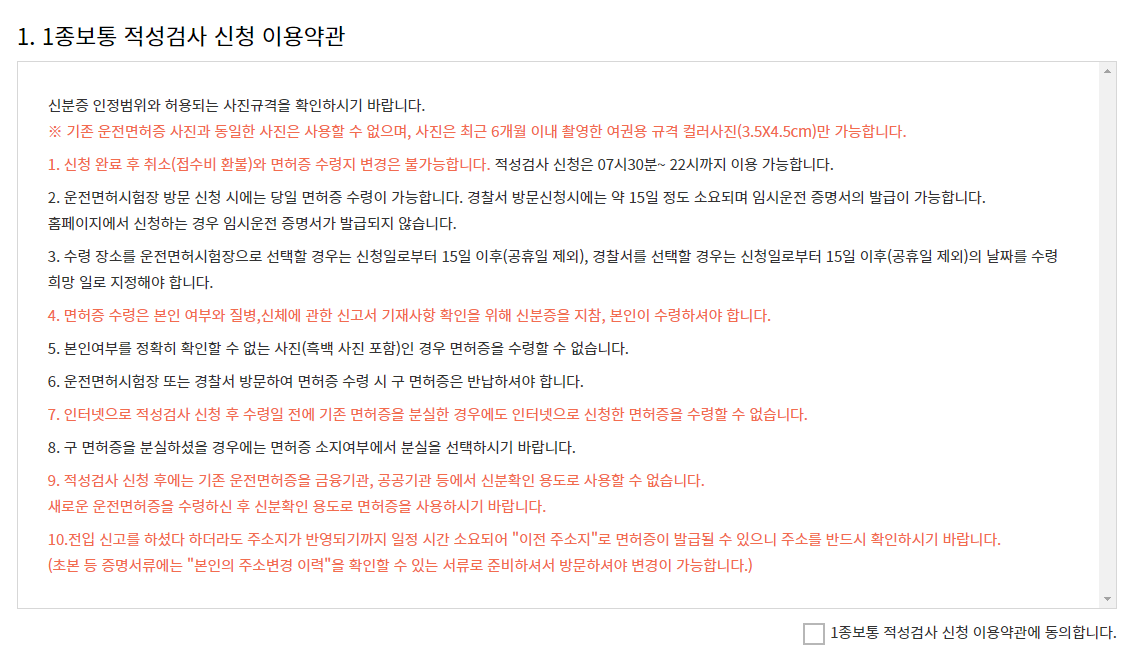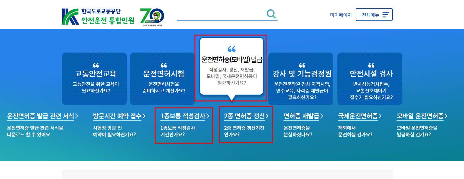 홈페이지에 들어오셨다면, 위 빨간 박스에 보이는 운전면허증 발급 - 1종보통 적성검사 또는 2종 면허증 갱신으로 들어가 주세요.