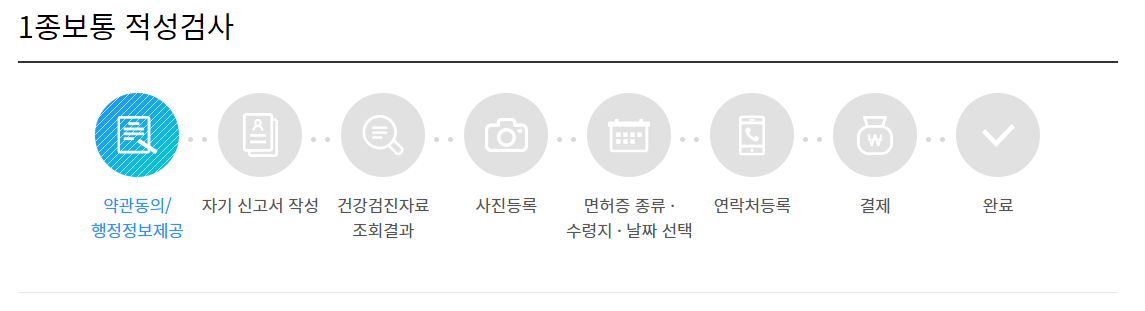 다음으로 신고서 작성, 건강검진 결과 조회, 사진 등록, 수령지 선택 등 순서대로 진행하면 간단하게 운전면허 갱신이 완료됩니다.