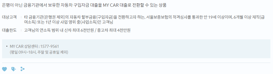 - 대출 대상 차량: 중고차(승용차, 승합차, 개인택시, 2.5톤 이하 화물차, 캠핑카, 대형이륜차)