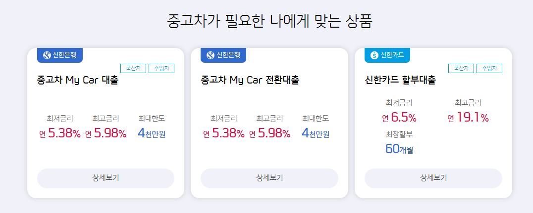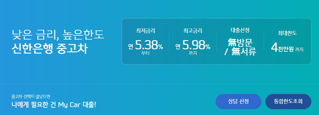 중고차를 고려 중인 분들은 신한 마이카 대출을 통해 금리 혜택과 함께 안정적인 차량 구매를 진행해 보시기 바랍니다.