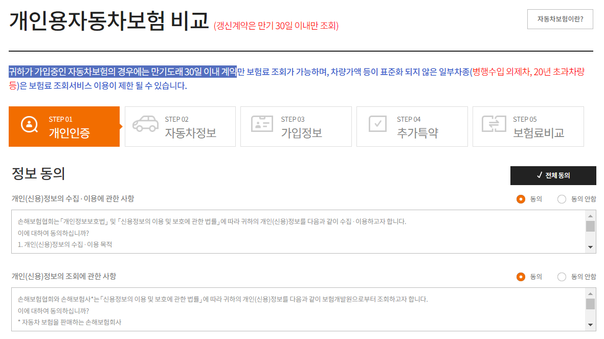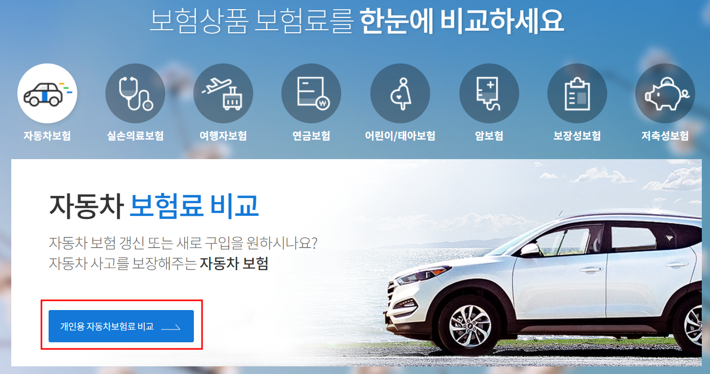 홈페이지에 들어가셔서 자동차 보험료 비교를 클릭하신 후 개인용자동차보험 비교 개인인증까지 완료해줍니다.