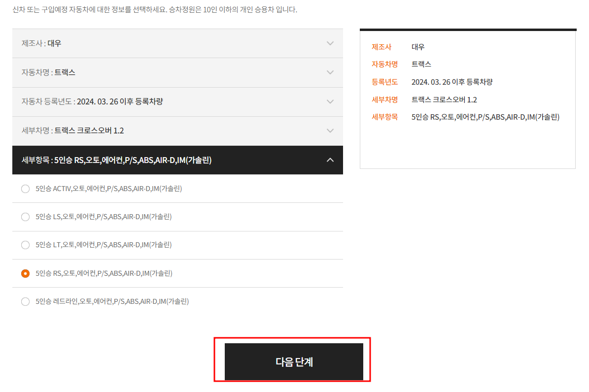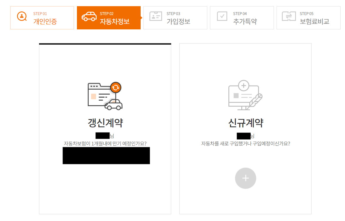 다음으로 차량의 보험가입이 신규인지 갱신인지 선택한 후 차량의 세부 정보를 선택합니다.