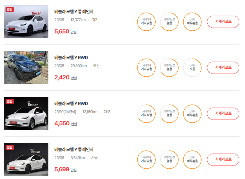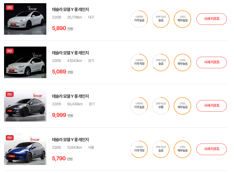 테슬라 모델 Y의 중고차 매물은 엔카 183대, KB차차차 77대, K카 2대로, 엔카에서 가장 많은 매물이 등록되어 있습니다. 다양한 매물과 옵션을 한눈에 비교할 수 있는 엔카는 중고차 시장에서 가장 유용한 플랫폼으로, 모델 Y의 주요 트림과 연식별로 다양한 선택지를 제공합니다.