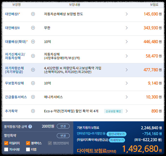 - 특약 추가: 블랙박스 할인, 마일리지 특약, 다자녀 특약 등 자신에게 유리한 특약을 선택하세요.